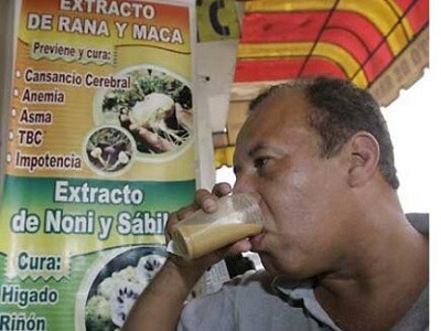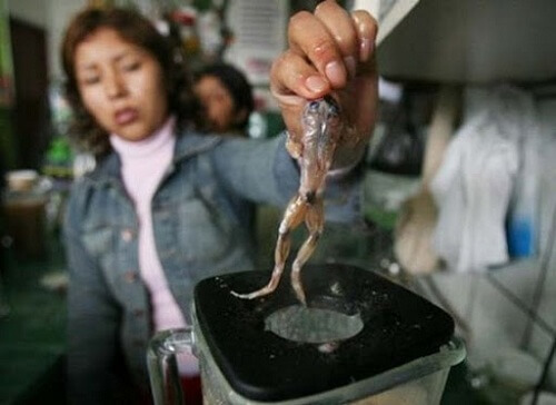 Sudah tentu anda biasa minum pelbagai jenis jus, seperti jus buah dan sayur atau campuran kedua-duanya untuk menjaga kesihatan dan mengubati penyakit. Namun, bagaimana jika anda ditawarkan jus katak?Benar, jus katak ternyata benar-benar terbukti dan mempunyai khasiat untuk mengubati beberapa penyakit, tapi bagi orang-orang tertentu, jus ini lebih popular kerana ia boleh mengubati penyakit mati pucuk pada lelaki.Di Peru, jus seperti ini kerap disebut ‘Ubat Kuat’ kerana sangat sesuai bagi pesakit yang mengalami lemah tenaga batin. Masyarakat Peru percaya jus katak mempunyai khasiat sebagai penambah stamina. Jus katak atau extracto de rana ini sememangnya laris di pasaran tempatan Bandar Lima. Kerana, selain untuk rawatan mati pucuk, jus ini juga dapat mengubatipelbagai penyakit lain seperti, asma, bronkitis, dan lemah tubuh badan.